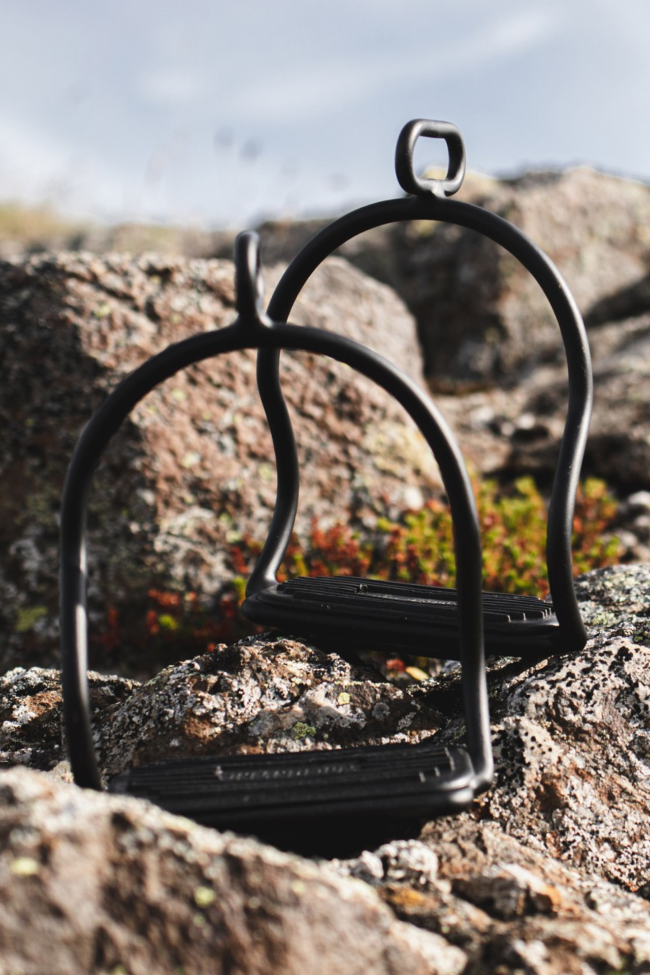 Hållbara säkerhetsstigbyglar från Top Reiter, tillverkade av rostfritt stål och erbjuder ett bra fotfäste.